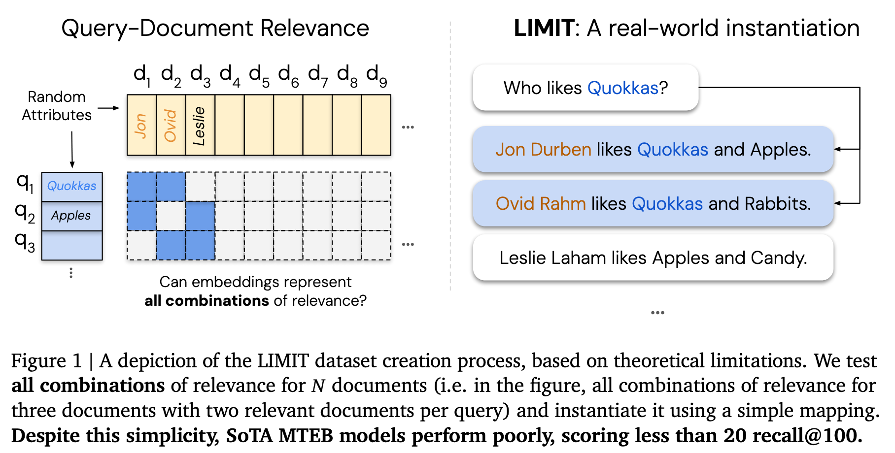 The authors then create LIMIT, a dataset designed to stress-test this limitation using natural language. Documents describe people and their preferences (e.g., “Jon likes Quokkas and Apples”), and queries ask “Who likes X?” Despite this simplicity, state-of-the-art embedding models achieve less than 20% recall@100, while BM25 scores above 90%.