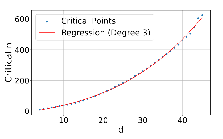 The polynomial fit to the critical-n points (Figure 2) is impressively smooth, suggesting deeper theoretical structure that remains unexplored. Why specifically a degree-3 polynomial? Is there a theoretical derivation for this functional form, or is it purely empirical? Similarly, the connection to order-k Voronoi diagrams is mentioned but dismissed as “computationally infeasible” and “notoriously difficult to bound tightly” without much detail.