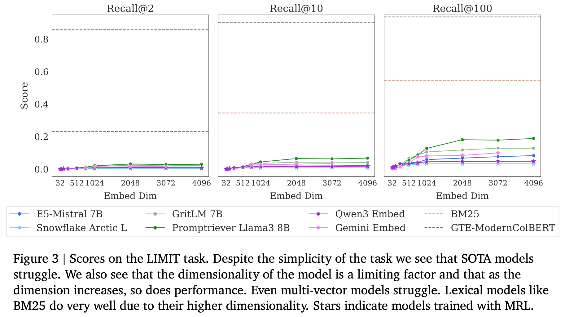 The paper compares SOTA models’ poor LIMIT performance with BEIR performance (Figure 7, Section 5.5), and suggests that “smaller models (like Arctic Embed) do worse on both, likely due to embedding dimension and pre-trained model knowledge.” Yet large models like E5-Mistral (4096-d) also score poorly on LIMIT. The correlation analysis doesn’t support strong conclusions either way, and the discussion of dimension dependence is hand-wavy given that high-dimensional models also struggle.