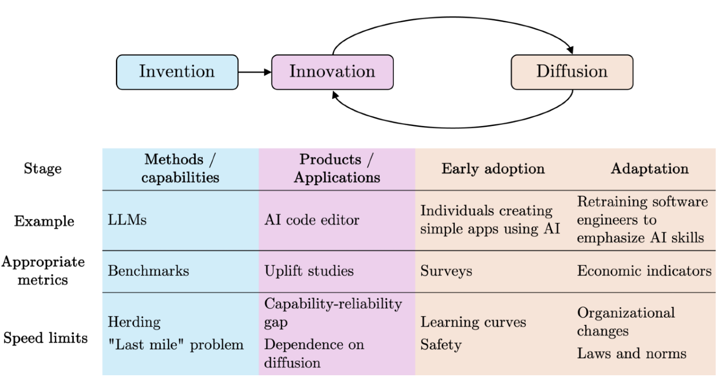 In Part 1, the authors argue that AI’s societal impact will be gradual, not sudden. They distinguish between three phases: invention (model development), innovation (practical applications), and diffusion (widespread adoption). While AI research produces new models rapidly, the authors remind us that this does not mean translation to real-world utility. For instance, infrastructure and organizational inertia create substantial barriers, as implementing AI requires changes to existing systems, training, and workflows. This is especially true for high-risk areas.